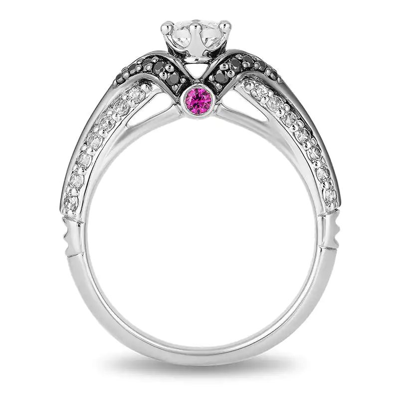 - Two rows of shimmering diamonds along the shank and two bezel-set bright red rubies under the gallery decorate this epic design.