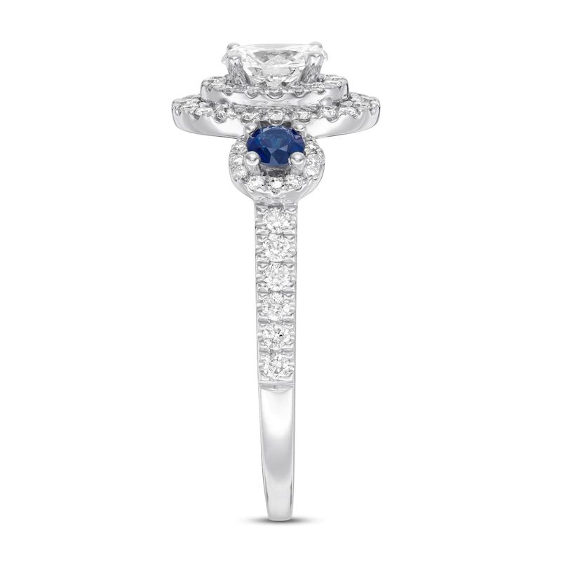 Exquisitely styled, this engagement ring features a 1/2-carat oval diamond center traced in two rows of round diamonds, and flanked on either side by round natural sapphires, symbols of purity. Additional round diamonds line the band, while princess-cut sapphires enliven each profile to complement the design. Crafted of 14K white gold, the ring has a total diamond weight of 1 carat.